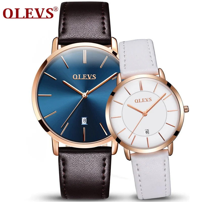 OLEVS Ultra Thin Lover Couple Quartz Wristwatches Blue Dial Auto Date Leather Strap Waterproof Men